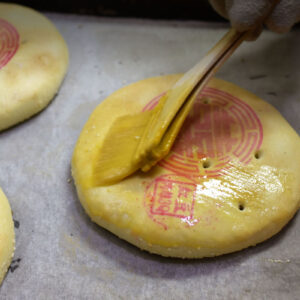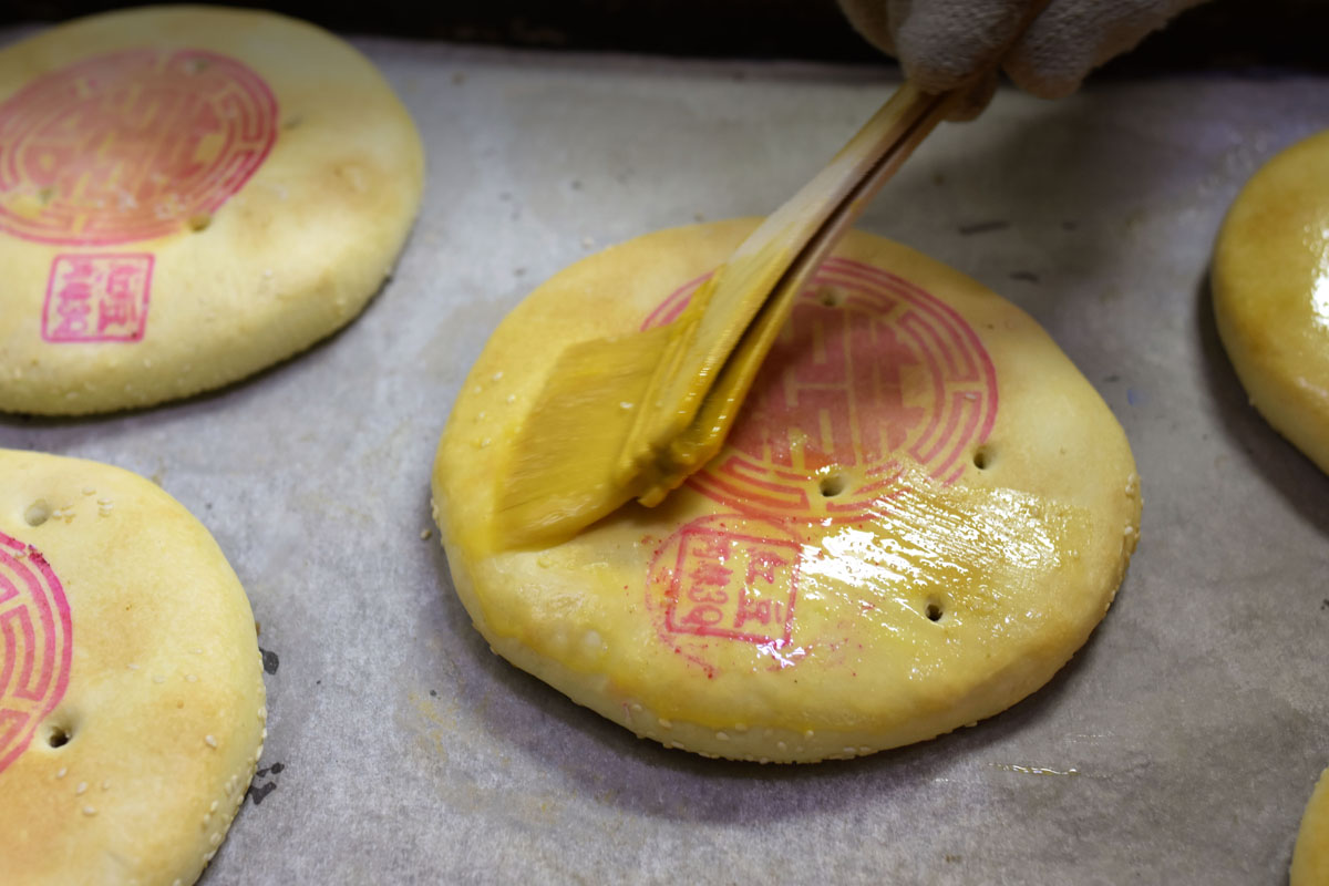 自製內餡肉絲,精選後腿肉切塊入鍋翻炒,淋上薄鹽醬油與甘草、肉桂、八角等天然辛香料,慢火燉煮數小時,直到肉質軟嫩入口即化,包入內餡,桿平後沾白芝麻,烘焙至金黃色香氣撲。